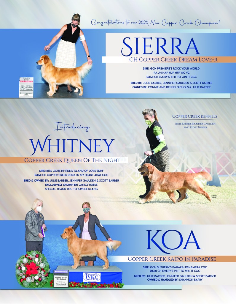 From left to right: CH Copper Creek Red Solo Cup “Toby”, CH Copper Creel Dream Love-R ” Sierra” and CH Copper Creek Rock In My Heart Away CGC “PrimRose”